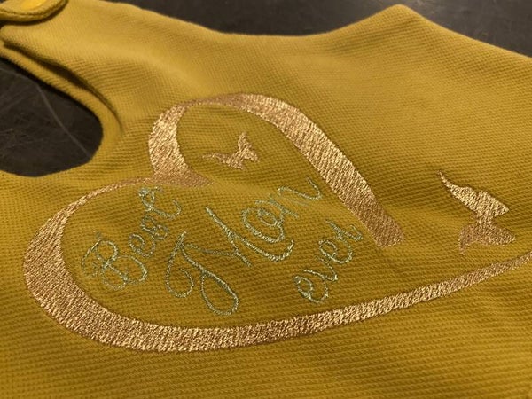 „Best Mom ever „ schmückt diesen Strampler in Größe 56 im modischen Senfton. Beste Baumwolle mit Elasthan wurde verarbeitet und liebevoll bestickt.