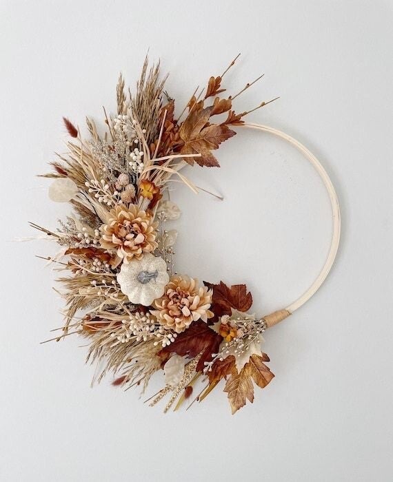 Verarbeitet werden bei dem Stil vor allem Naturmaterialien wie Eukalyptus kombiniert mit getrockneten Blumen oder Gräsern wie Pampasgras. Die Farben sind eher gedeckt und zurückhaltend. Die Kränze werden so gebunden, dass sie locker und nicht allzu gestylt aussehen.